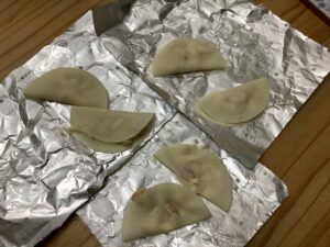 餃子の皮に、具材をのせて、皮を半分に折りました。